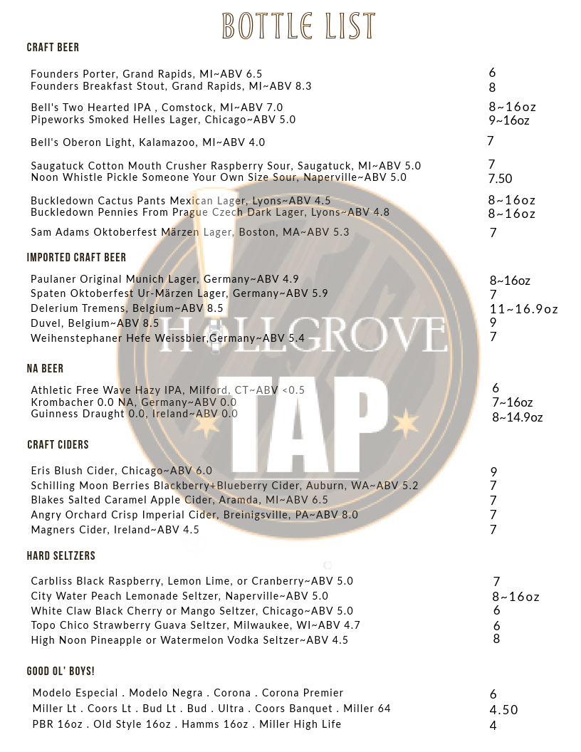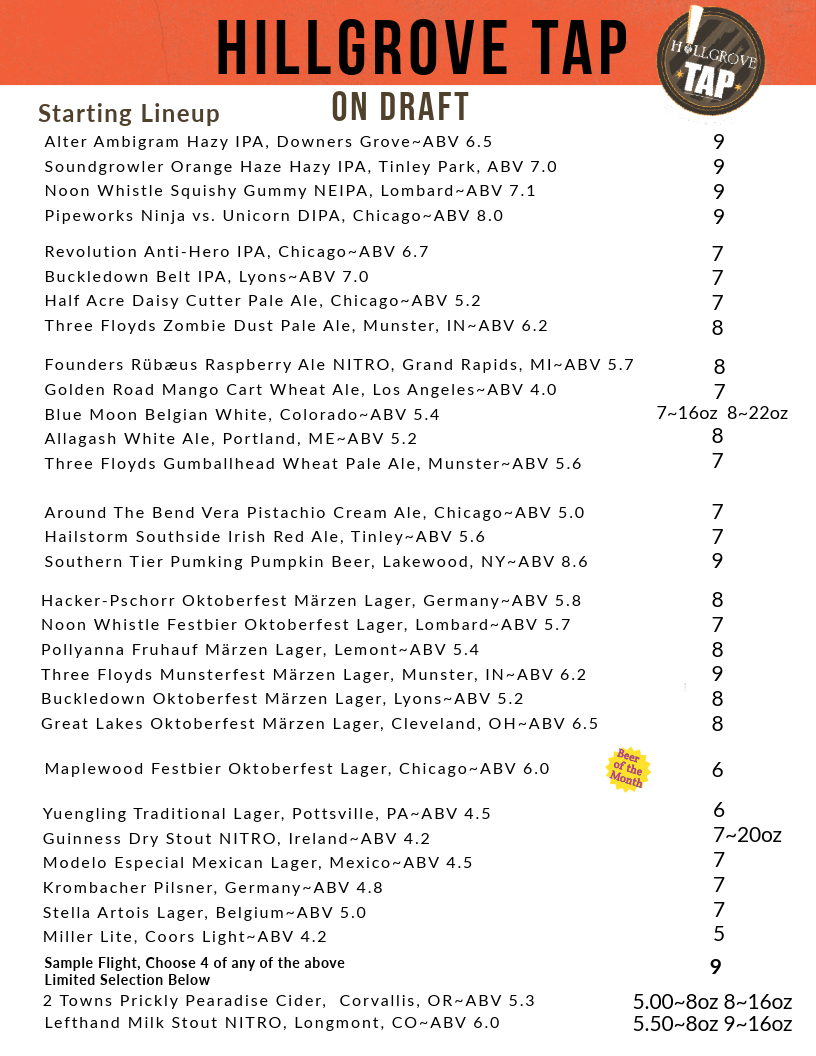 SAUSAGE PLATTER, FISH TACOS, HILLGROVE CHEESEBURGER, RUEBEN, PATTY MELT